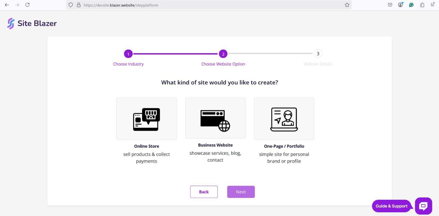 In this step, you’ll select the Content Management System (CMS) that will power your website. SiteBlazer provides three robust options, each designed to suit different needs and experience levels: