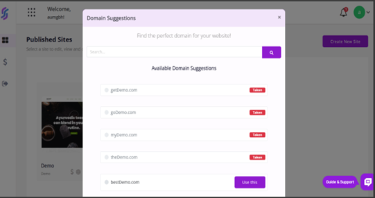 Pre-filled domain suggestions are smart name ideas generated for you based on your business or keywords. Use these suggestions to quickly find and pick the perfect domain for your website, making setup faster and easier.