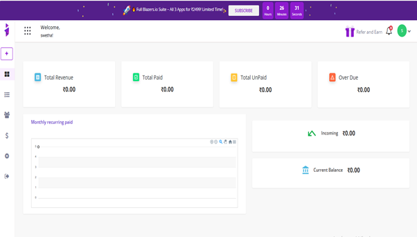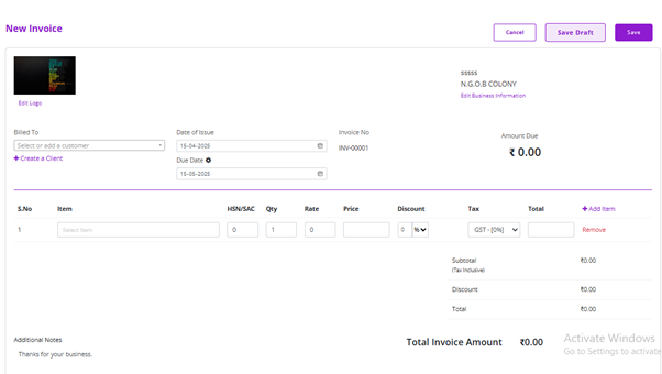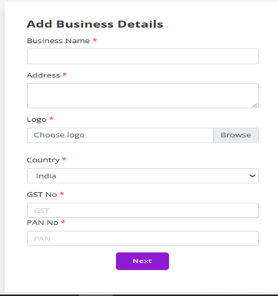 - After successfully logging in to your Invoice Blazer account, navigate to the dashboard, and then you need to fill in the details like Business Name, Address, Logo, Country, GST, and PAN Number.