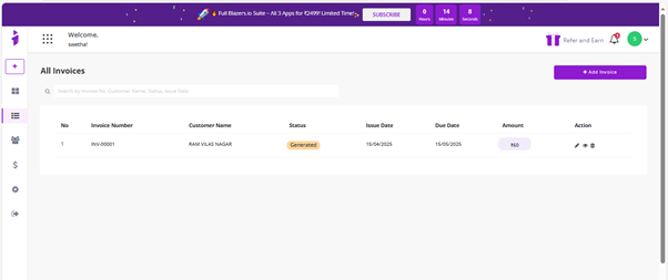 - The generated invoice, along with its current status, will be displayed below for your reference.