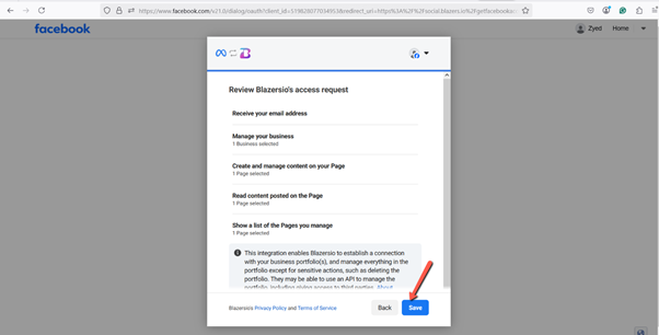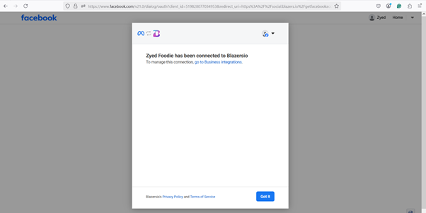 - Finally, you will see a confirmation message indicating that your Facebook page has been successfully connected to your Social Blazer account.