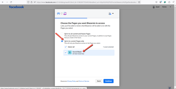 - In this step, you need to select the “Opt-in to Current Pages” option. After that, choose the specific Facebook page you want to connect or manage through Social Blazer.