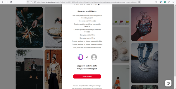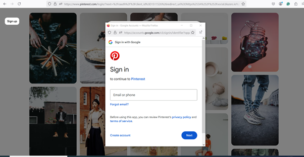 - You will be redirected to the login page, where you need to enter your Google username and password to sign in and authorize the connection between your Pinterest account and Social Blazer.